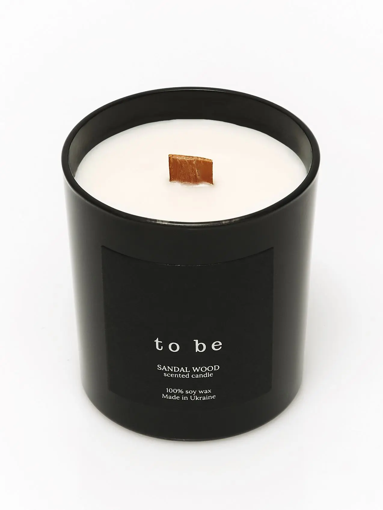 A scented candle made from soy wax with a wooden wick.